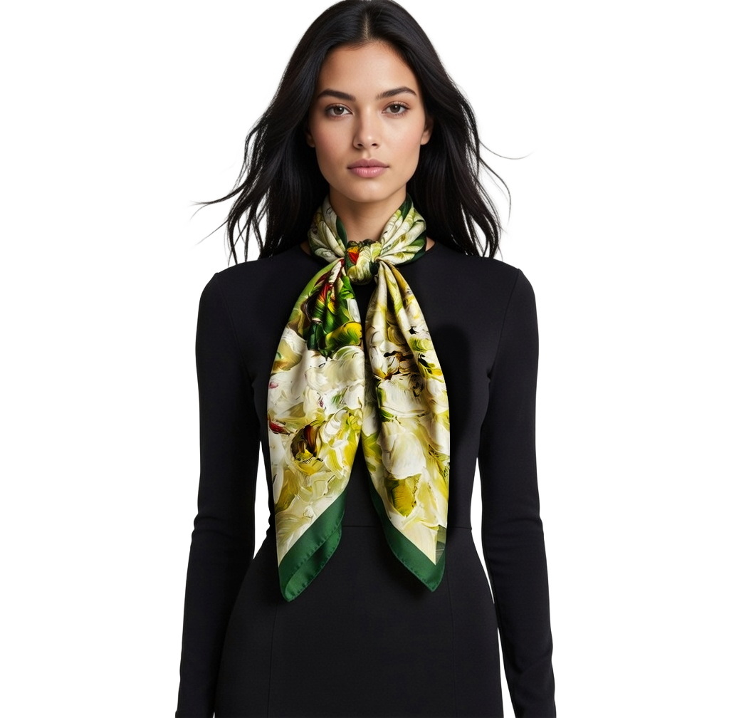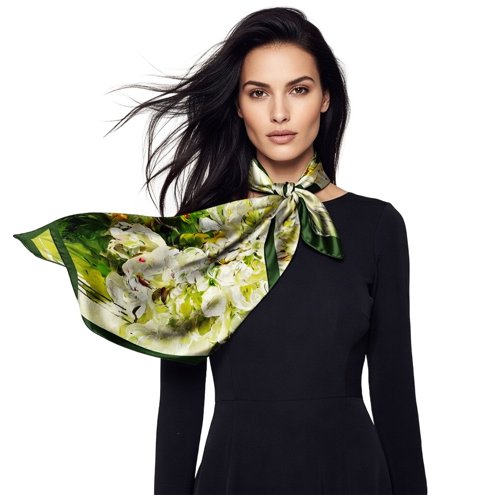 Przepiękna jedwabna apaszka, marki LaDorena® wykonana z najwyższej jakości naturalnej satyny jedwabnej o rzadko dostępnej grubości aż 12 M/m, Wymiary 65x65 cm. Chusta zachwyci każdą elegancką kobietę.