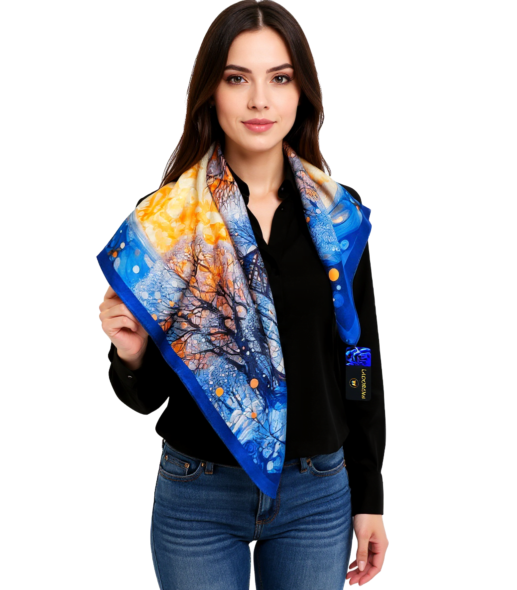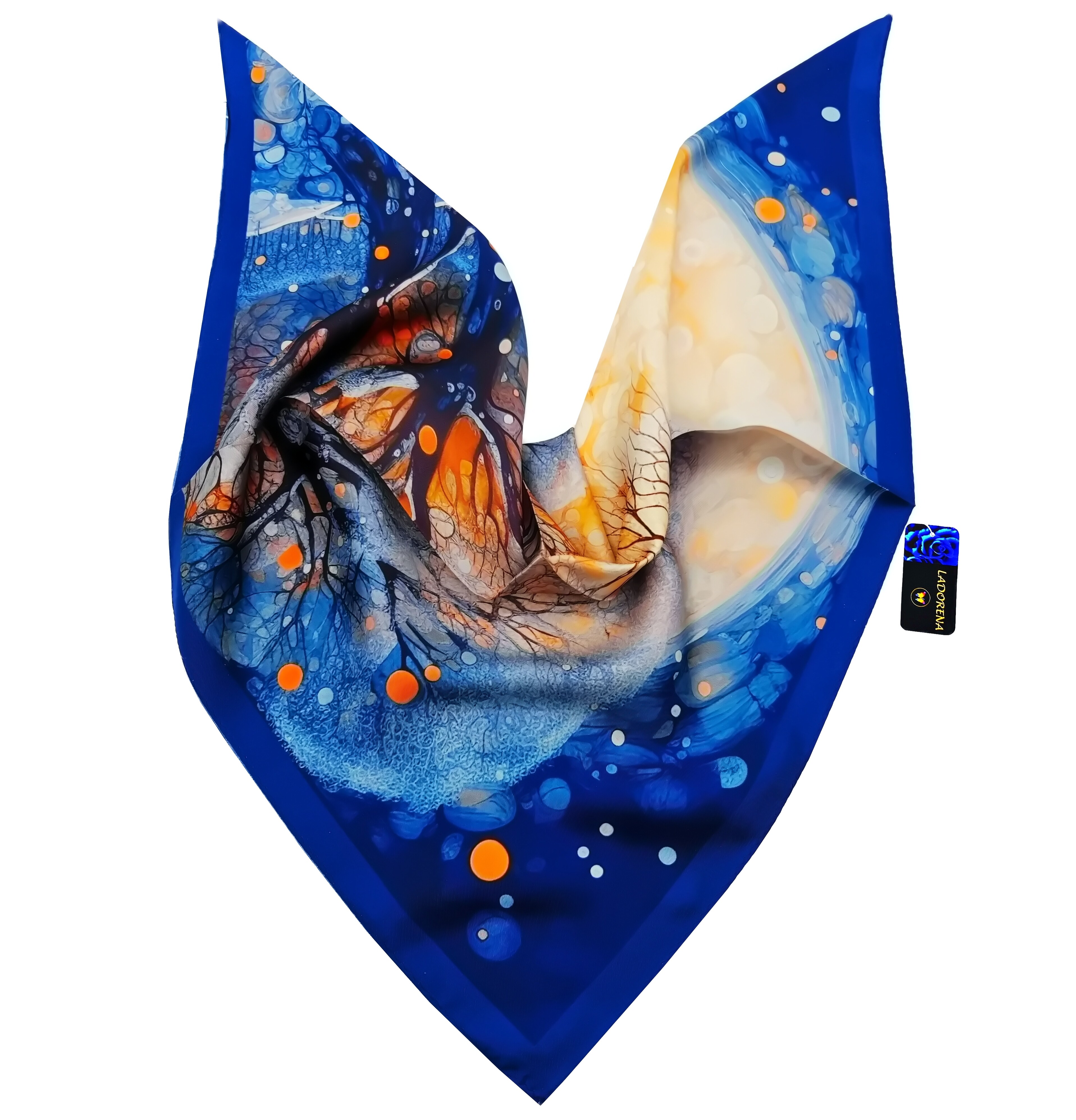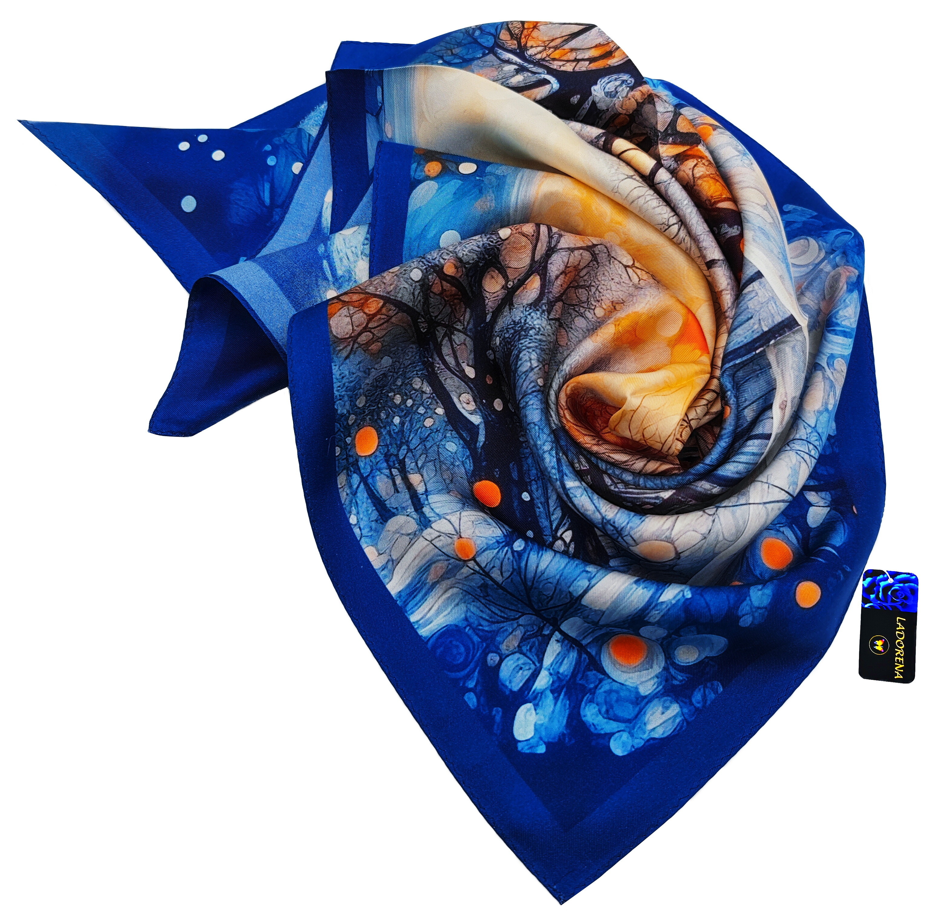 Przepiękna jedwabna apaszka, marki LaDorena® wykonana z najwyższej jakości naturalnej satyny jedwabnej o rzadko dostępnej grubości aż 12 M/m, Wymiary 65x65 cm. Chusta zachwyci każdą elegancką kobietę.