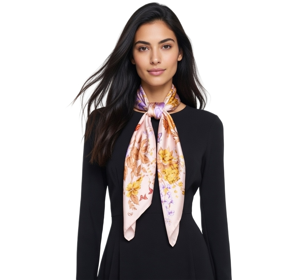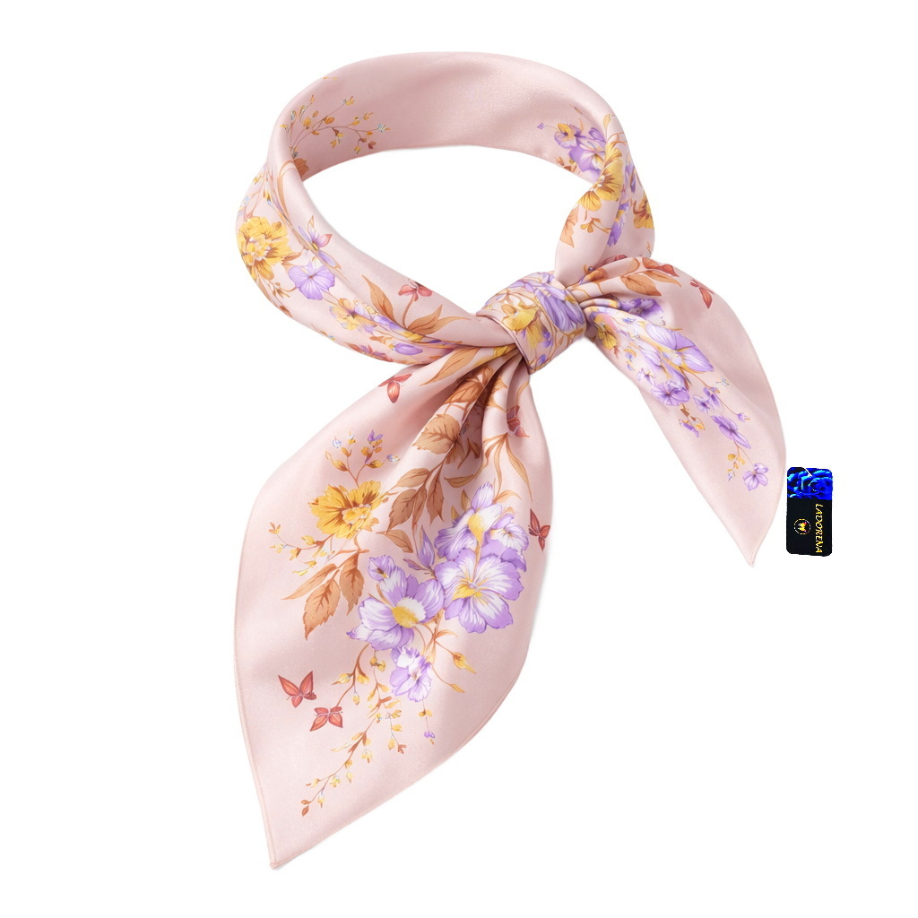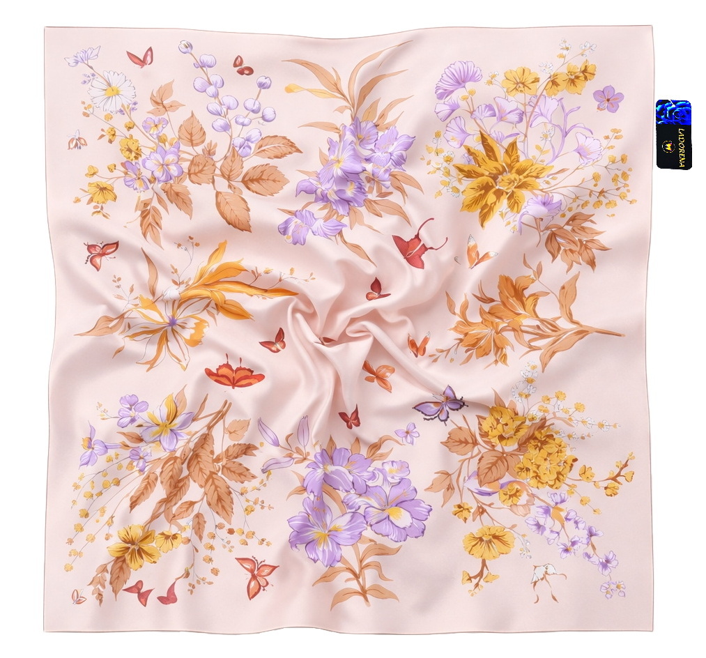 Przepiękna jedwabna chusta, marki LaDorena® wykonana z najwyższej jakości naturalnej ciężkiej satyny jedwabnej o rzadko dostępnej grubości aż 14 M/m, Wymiary 90x90 cm. Chusta zachwyci każdą elegancką kobietę.