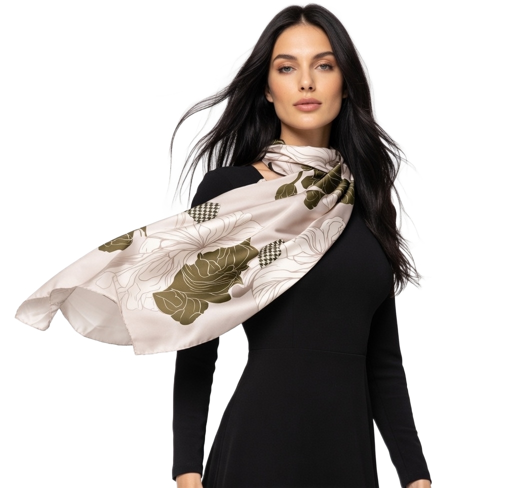 Przepiękna jedwabna chusta, marki LaDorena® wykonana z najwyższej jakości naturalnej ciężkiej satyny jedwabnej o rzadko dostępnej grubości aż 14 M/m, Wymiary 90x90 cm. Chusta zachwyci każdą elegancką kobietę.