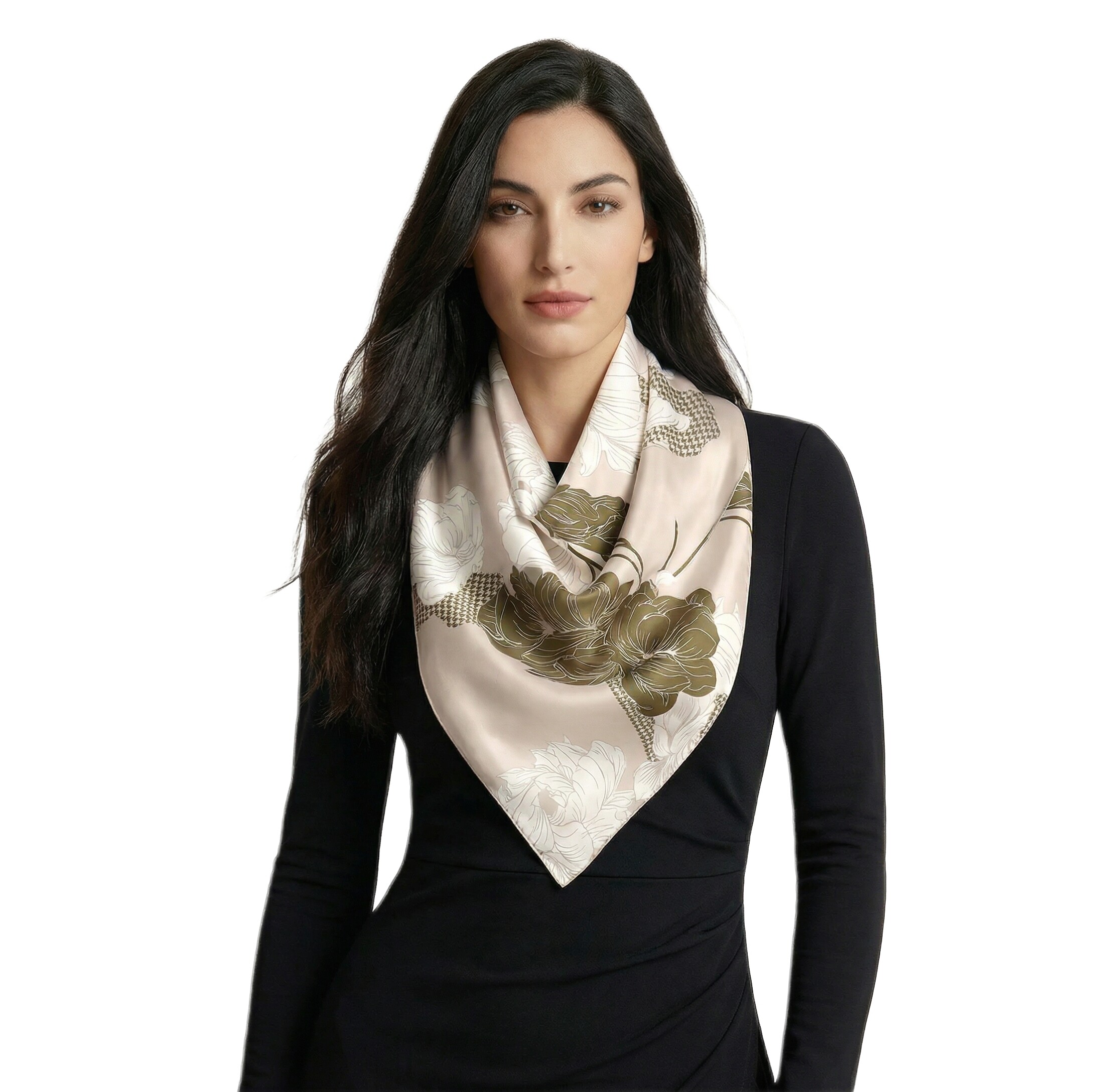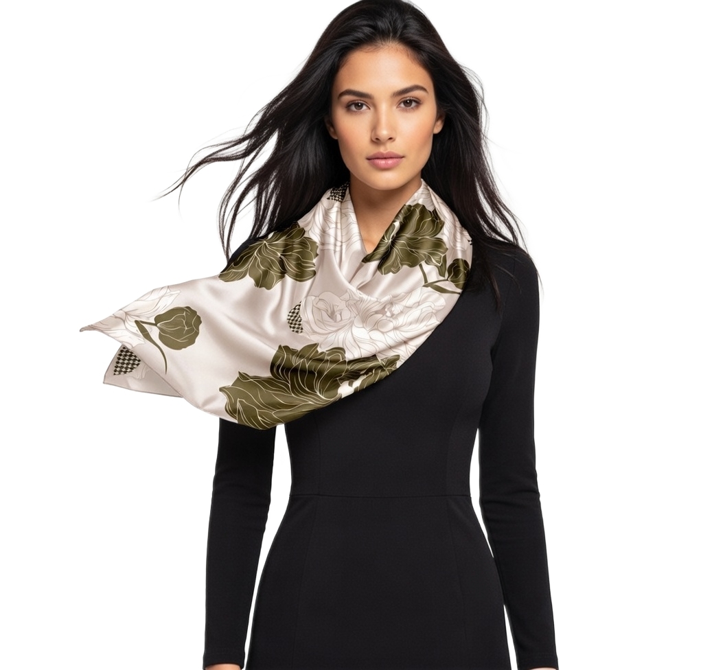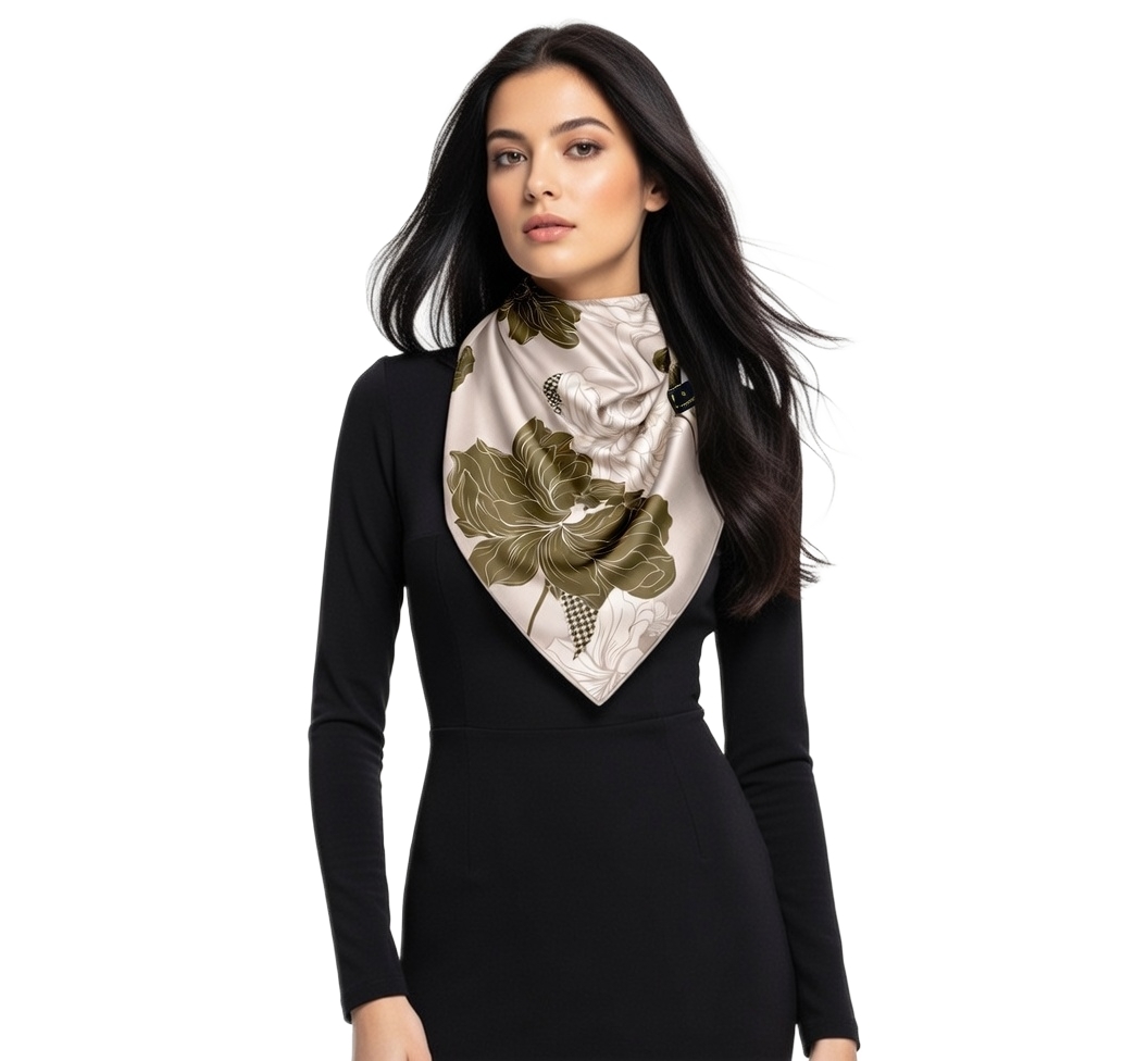 Przepiękna jedwabna chusta, marki LaDorena® wykonana z najwyższej jakości naturalnej ciężkiej satyny jedwabnej o rzadko dostępnej grubości aż 14 M/m, Wymiary 90x90 cm. Chusta zachwyci każdą elegancką kobietę.
