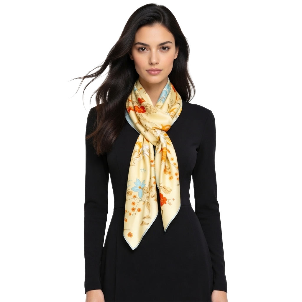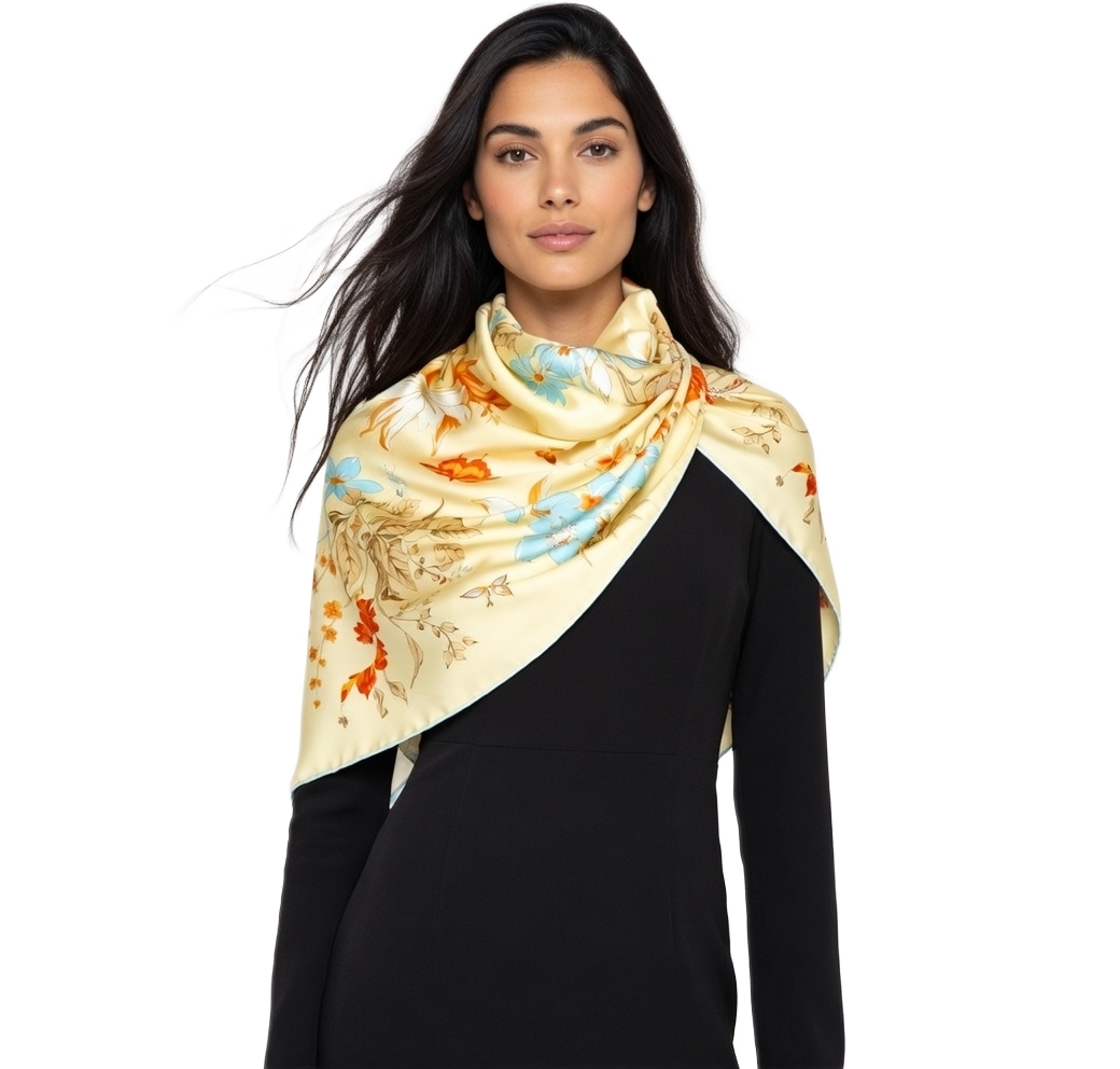 Przepiękna jedwabna chusta, marki LaDorena® wykonana z najwyższej jakości naturalnej ciężkiej satyny jedwabnej o rzadko dostępnej grubości aż 14 M/m, Wymiary 90x90 cm. Chusta zachwyci każdą elegancką kobietę.