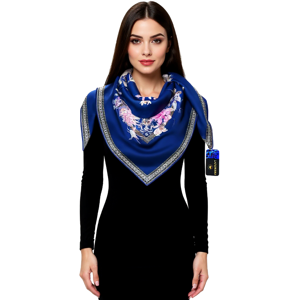 Przepiękna jedwabna chusta, marki LaDorena® wykonana z najwyższej jakości naturalnej ciężkiej satyny jedwabnej o rzadko dostępnej grubości aż 14 M/m, Wymiary 90x90 cm. Chusta zachwyci każdą elegancką kobietę.