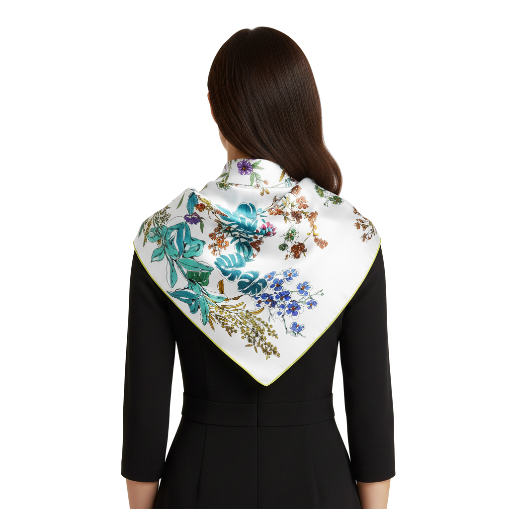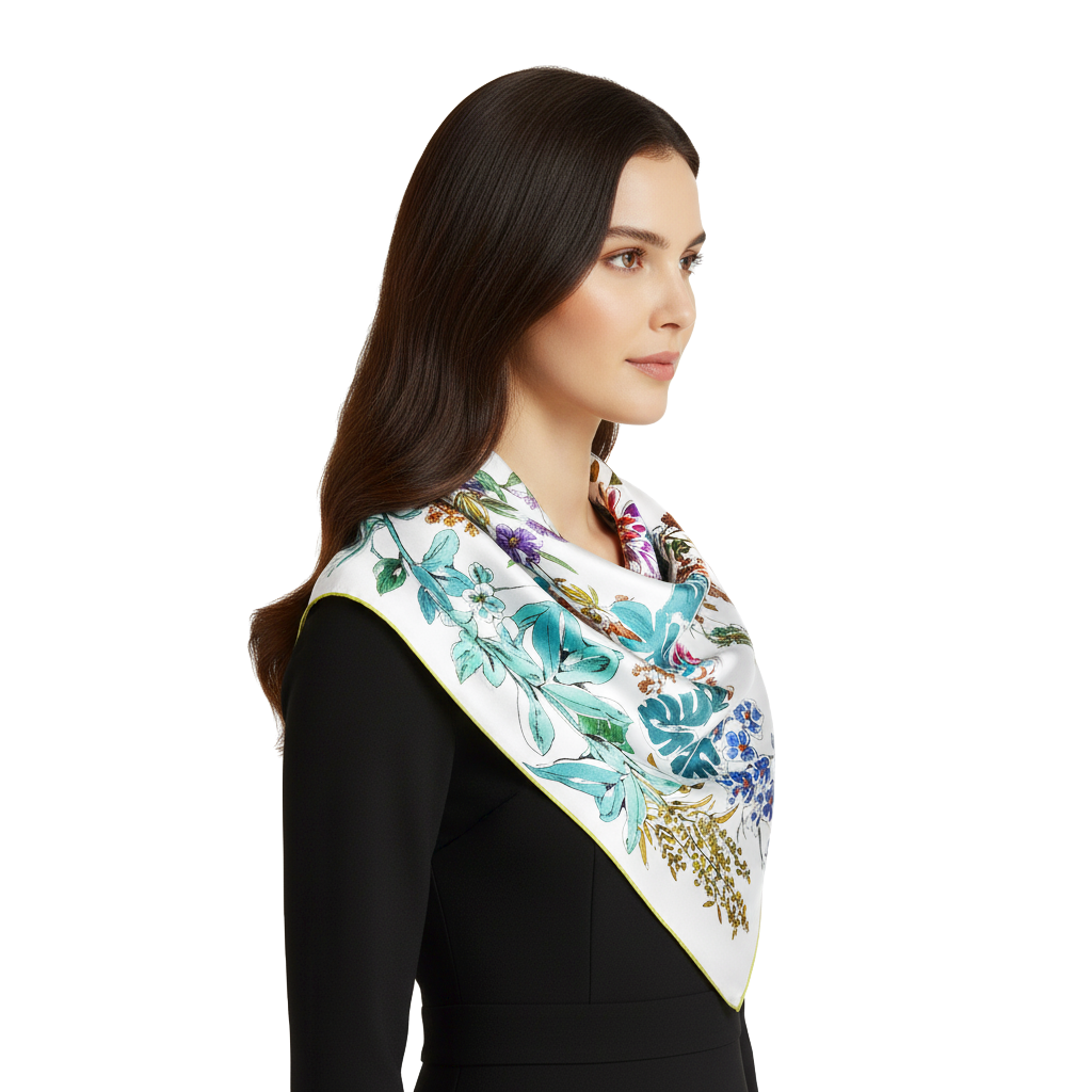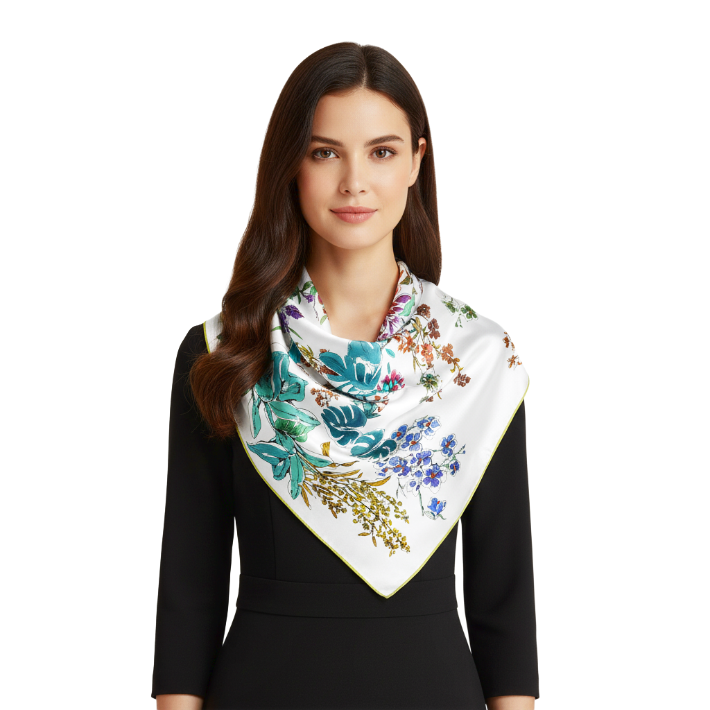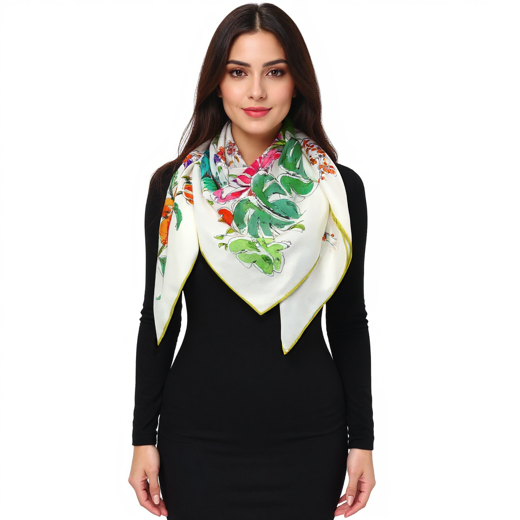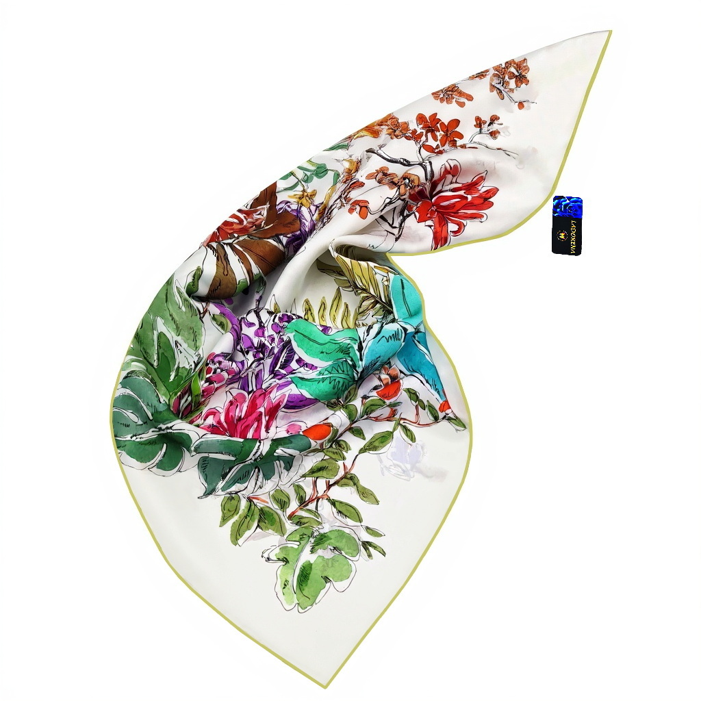Przepiękna jedwabna chusta, marki LaDorena® wykonana z najwyższej jakości naturalnej ciężkiej satyny jedwabnej o rzadko dostępnej grubości aż 14 M/m, Wymiary 90x90 cm. Chusta zachwyci każdą elegancką kobietę.