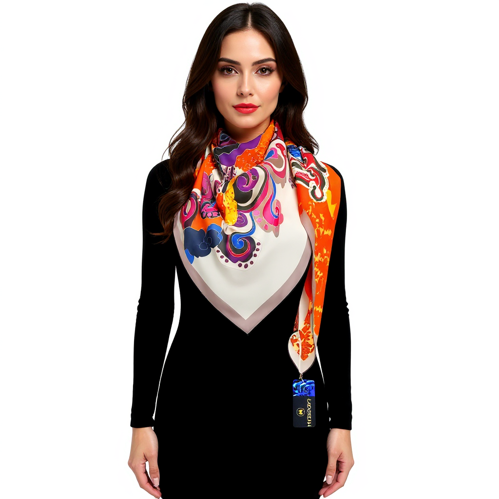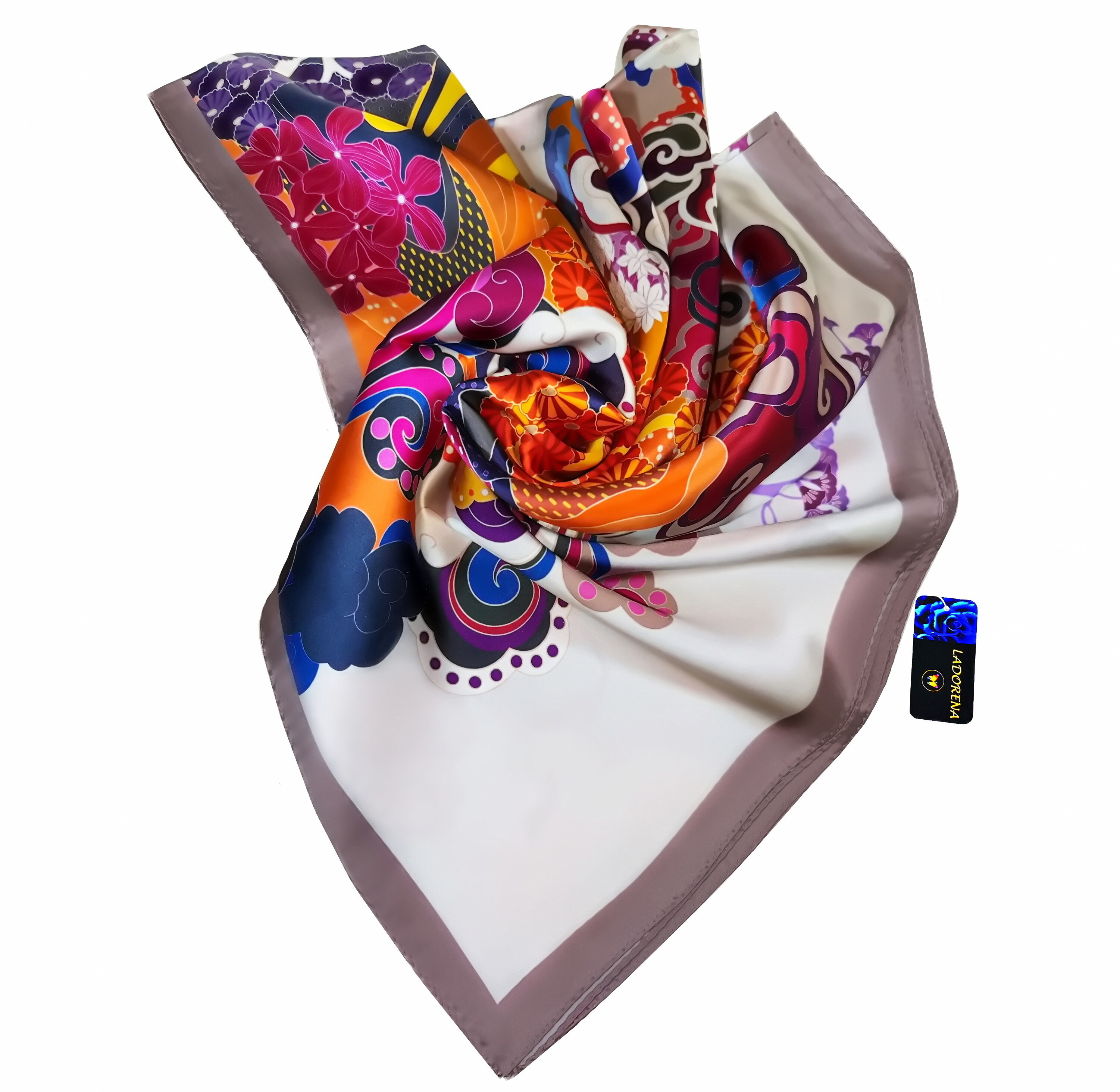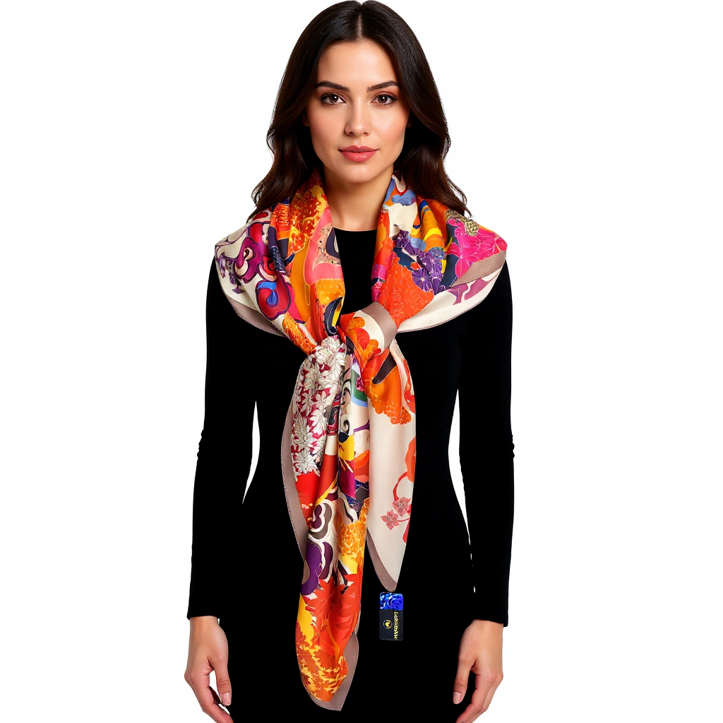 Przepiękna jedwabna chusta, marki LaDorena wykonana z najwyższej jakości naturalnej satyny jedwabnej o rzadko dostępnej grubości aż 16 M/m, Wymiary 105x105 cm. Chusta zachwyci każdą elegancką kobietę.